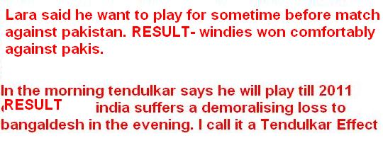 Bidhan40 bro, You're trying to act like a hypocrite out here. Comeon now, don't try to be an outcast yaar. Who the fuouk cares who Sachin Scores his centuries against? What about his performances against Lanka and that out of this world98 against Pakis at the world cup? The truth is, Sachin is the greatest batsman of modern era followed by current day Ponting, lara comes third, check the records and your facts right. What about Lara's 375 and 400 against England ni? Did he score it against Australia or something? Get your facts rightbro. More than 70 percent of cricket lovers would opt for tendulkar over lara any day, so don't try to be hypercool by saying that lara is better. India, my team lost today. But Pakis got knocked off by Ireland haha what a day! At least something went right for me.