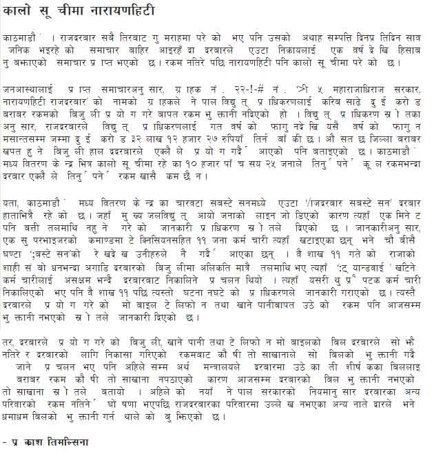 I just couldn't believe that the consumption of electricity by the palace equals to that of the six districts in Nepal, they don't have to through loadshedding, and on top of that, they don't even pay the bills?I guess these are the reasons we should get rid of monarchy.