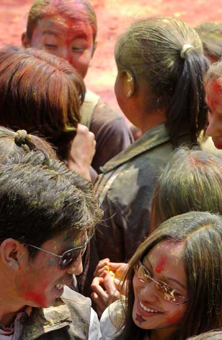 Holi in Nepal has become a new game of egoism between boys and girls. Yes, sexual appeal is there. Pics by Bikash Karki Words by DW People of Nepal with Hindu religion celebrated Holi or the Fagu Purnima, the festival of color (and these days dirty water as well) with full enthusiasm. People in Kathmandu enjoyed the festival totally forgetting that Comrade Maoists are blocking them inside the valley from today. Yes there something historical background behind this festival but in the modern days, throwing colors and colored water has become a kind of “sex-war”, if I can use this term here, between the young folks. I could see boys and girls targeting the water-filled balloon each other. The nasty thing about this is that girls are in the sufferers’ end. Boys start attacking them with balloons days ahead of the festival day. We saw that yesterday and the day before yesterday when newspapers in Kathmandu published boys harassing girls walking on the streets by throwing water and balloons on them. Okay, given the chance, girls are also not very much different. They too mercilessly attack boys walking alone on the streets. We can hardly see boys attacking boys with balloons. That is why Holi is becoming a different kind of festival. “Look, look, look,” a colleague in my office was saying the other day pointing out small boys who were throwing balloons to girls of their age. “Even in this age, they know its about throwing balloons over girls.”