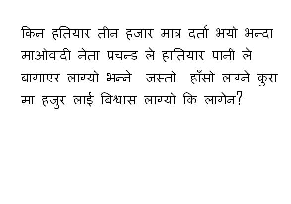 je mann laayo tehi bolchha, na boli ko thegaan, na niti ko thegaan, na charitra ko thegaan, testaa ko kuro ke patyaaunu? kahile gaadeko sun (gold) harayo bhanchha, kahile ramro ramro hatiyaar kholaa le bagaayo bhanchha, kahile ISI le hatiyaar dine bhaneko haamile liyenau bhanchha, kahile raaja sita bhitri saathgaath chha bhancha, kahile feri rajtantralaai ukhelna yetro ladaai ladeko bhanchha, kahile malaai bish khwayera maarna laayo bhanchha, kahile malaai maarna durbarle 2 arab paisha kharchha garyo bhanchha, hayyyyyy ..... kunai euta kuro bhaye po, sadhai yestai torilaaure kuro garekogarei chha, taipani uhi hiro nepalmaa, yehi ta holaa sati le saraapeko desh bhaneko
