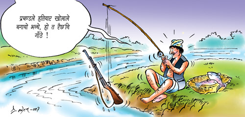I somehow believe in Prachanda's comment on weapons registration issee.Since, they dont have any money to feed their so called "PLA", and Nepal government is too confused to provide basic services( which i think was a wrong idea anyways, if they can kill innocent people, cops and army, i am sure they can feed themselves too) i am sure they chopped those weapons in pieces and provided soup for PLAs. Poor Prachande dont want to admit that and saying "pani le bagayo?) DO you think we are stupid? or Do you just assume we are stupid? Did you have dream last night before you said that Prachande ? Cant believe a possible cabinet candidate is talking such bakwas. please have some respect for yourself and for your people and for your country too. i am sure rest of the world doesnt want to see a rebel leader being advanced to a top level who turns out to be a fool and makes shameful comments. i i hope you and your comrades die soon of Haija, as well as all Girijas and MAkunes Shree Pashupatinath le hami sabai k kalyan garun!!!