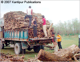 In this February 1 photo, Maoists at Khumroj VDC in Chitwan district load timber onto a truck for selling it elsewhere. In 2003, the Maoists had captured 57 hectares of jungle belonging to Pumori Agro Forest, and recently they started cutting down the Sishau (Acacia-Dalbergia) trees. On one single day, February 1, they sold off Sishau worth 1.5 million rupees. Maoist local area in-charge Krishna Aryal said the trees were felled on his party's orders. Locals said the authorities did not listen to their complaints against the destruction of the jungle. BINOD TRIPATHI