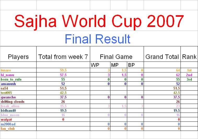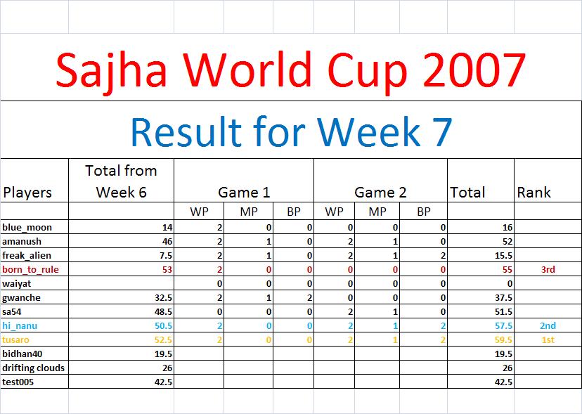 This is where we stand before the Saturday's the fianle. There is a huge upset that you can see here in the Sajha World Cup too, but that was expected anyways right? Thats what make cricket such a popular game! So, here I present you the result of WEEK 7 before Final to give everyone an idea where you and your opponents stand. Start brainstorming now guys and think about game plan for final, just like what Pointing and Jaysuriya might be doing right at this moment.