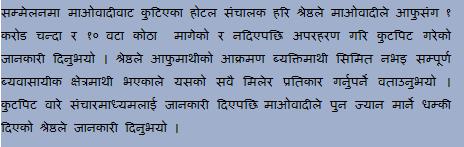 Let me make some sense here. bidhan40 G, -the person (or businessman) like hari torture people which are not published in daily newspaper. and when haris are tortured in Nepal, it becomes an issue. (here neither i'm supporting maoist nor their brutality and violence) but...my friend i'm in support of the people who became the victim of haris and who are suffering from such acts.... JUST IMAGINE THAT YOU ARE SUPPOSED TO COLLECT RS. 1,00,000 FROM MR. HARI...AND HE'S BEEN TELLING YOU THE STORY OF "JAYA BHOLI" IT'S YOUR Rs. 1,00,000... AND SUPPOSE IT'S BEEN TEN YEARS (YOU COULD HAVE DOUBLED YOUR Rs. 1,00,000 IF YOU HAD SAVED IN BANK)......WHAT WILL YOU DO? ......YOU'LL THINK AND THINK.....POLICE??????YOU'RE TIRED OF THIS POLICE .....AND JUST THINK..IT'S BEEN 10 YEARS....WHAT DO YOU THINK .....WHICH METHOD WILL YOU USE NOW? SEND SOME GUNDA (TELL THEM YOU'LL GIVE THEM 10% OF IT IF YOU GET BACK MY MONEY). NOW THESE GUNDA COULD BE MAOIST (IN TODAY'S CONTRARY)..... here my POINT is .........it's not about only Rs. 1,00,000 and it's not about only a person who has to get back his money from him ....and it's not only HIM ...as i mentioned there are many of them .........and they MUST get some lesson from this incident. -daum