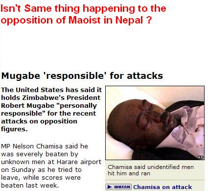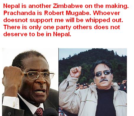 Bravo Bidhan-40, you exactly depicted the maoist thugs. Mugabe must be the GURU of prachanda ......any one who opposes mighty me has no room in this country - get lost !!!!