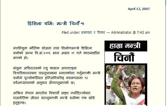 Yawn............. Ok That was Fantoosh Umesh's personal blog. It does not necessarily means that he write all the s*it for his personnal gain and we just do nothing??? Sucks... really sucks! Person from Jumla or in genaral other parts of Nepal can not start personal blogs to counter Umesh. So he is a lucky guy who can afford ( source may be donation as started by maoist for the same reason) blog. So, he should be responsible and unbiased in his deeds or needs to say openly that its a MAOIST PROPAGANDA BLOG then! Then nobody bothers to write. Chitwan Hero or Syami.... personal property bhandae jahatahee HAGNA paaeencha raw? Aru lae ganaaucha... Sammaj ma roog lagcha ne! Saymi dude Prabaas ma basko bhanchan, k he taha raincha yar... Aafnae Kotha ma halla gare panee Police aayeer sammtcha ne... 911 ma phone gardeeu???