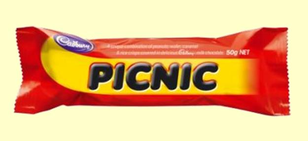 Here is mine. Combine thin delicate fingers of crisp wafer, the irresistible temptation of chewy caramel with the goodness of rice crisps, all generously encased in rich Cadbury chocolate....and you’ve got yourself ...... one pretty big, ugly looking chocolate bar really. Cadbury Picnic. Deliciously Ugly. yummy!!