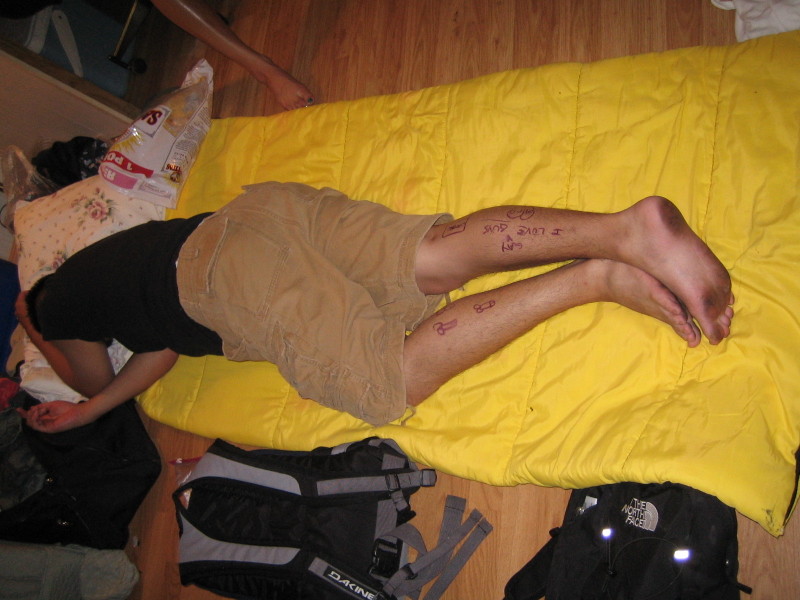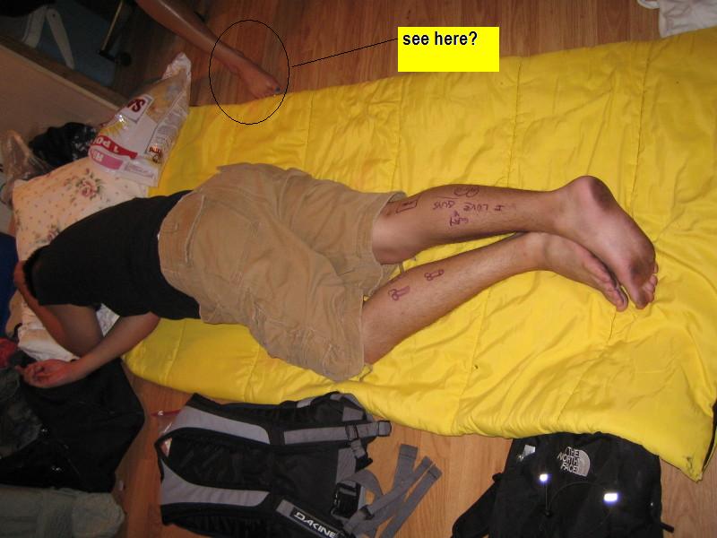 Those two penises drawn on his calf is a classic!! hahaha And he comes here looking for a chick!! wtf's wrong with dis kid?? hahahaha