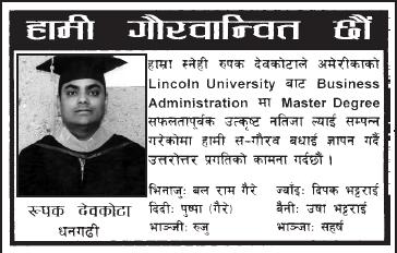 Badai chha Rupak dai!!!!k garne aaphule ta Lincol Univ. chodnu paryo.....tyapani best of luck 4 ur future.....n being the second nepali 2 graduate from Lincoln after Mamata Dipbim, the daughter of Madan Dipbim...