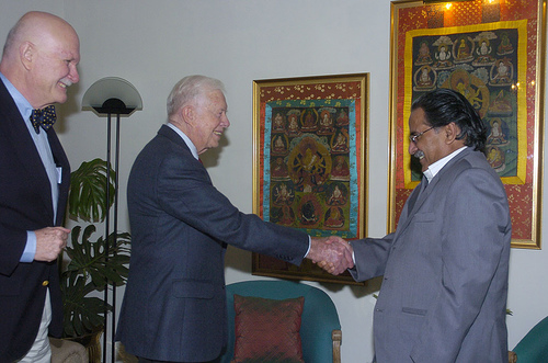 Carter, " This Commie must have borrowed this jacket from Mao himself.....man, where's your fashion sense?" Prachande, " You capitalist pig, you go back and tell that Imperialist Devil called Bush to ask the CIA to open me an untraceable Swiss bank account and deposit $10 million in exchange to operate an illegal prison right here for the Talibans and insurgents from Iraq. comprehende?" Carter's Assistant grinning," Man, then he'll be getting a $400 haircut like John Edwards, buy his suits from Canali and Brioni and smoke some Cohibas from Havana"