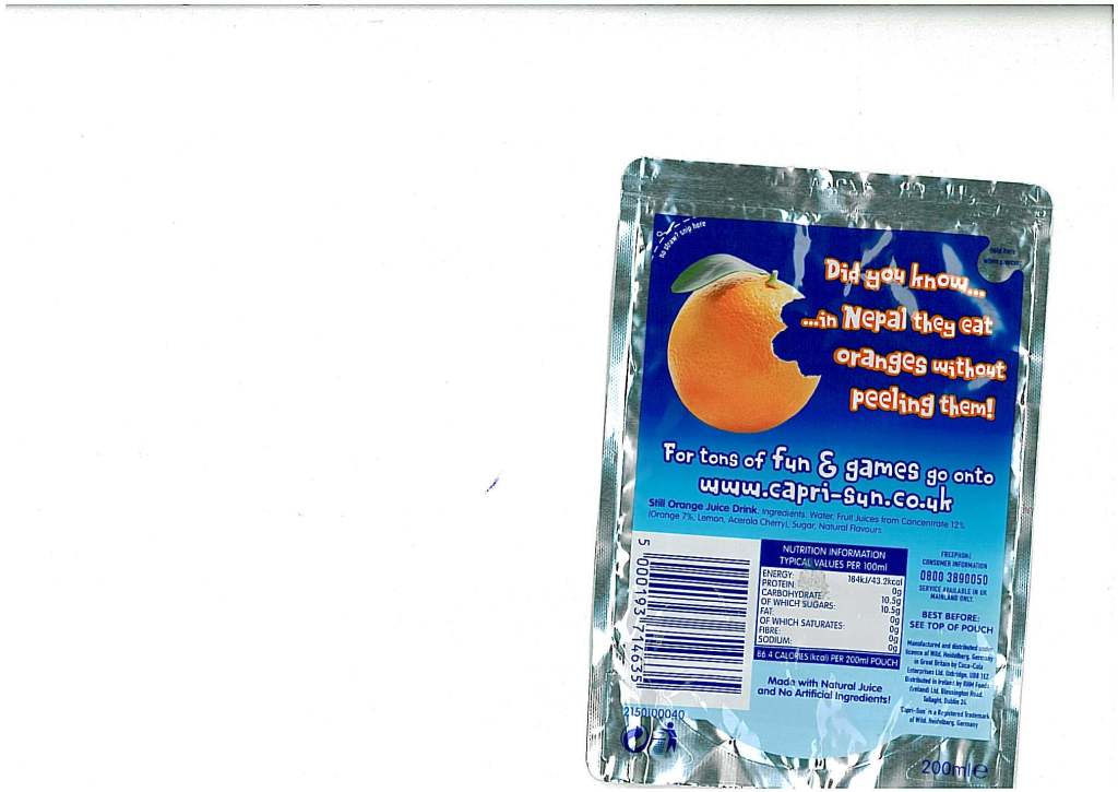 In Nepal People eat orange without peeling it when I got this drink I couldn't believe my eyes.. Drink is called Capri-sun orange juice.. Can buy around the stores in UK
