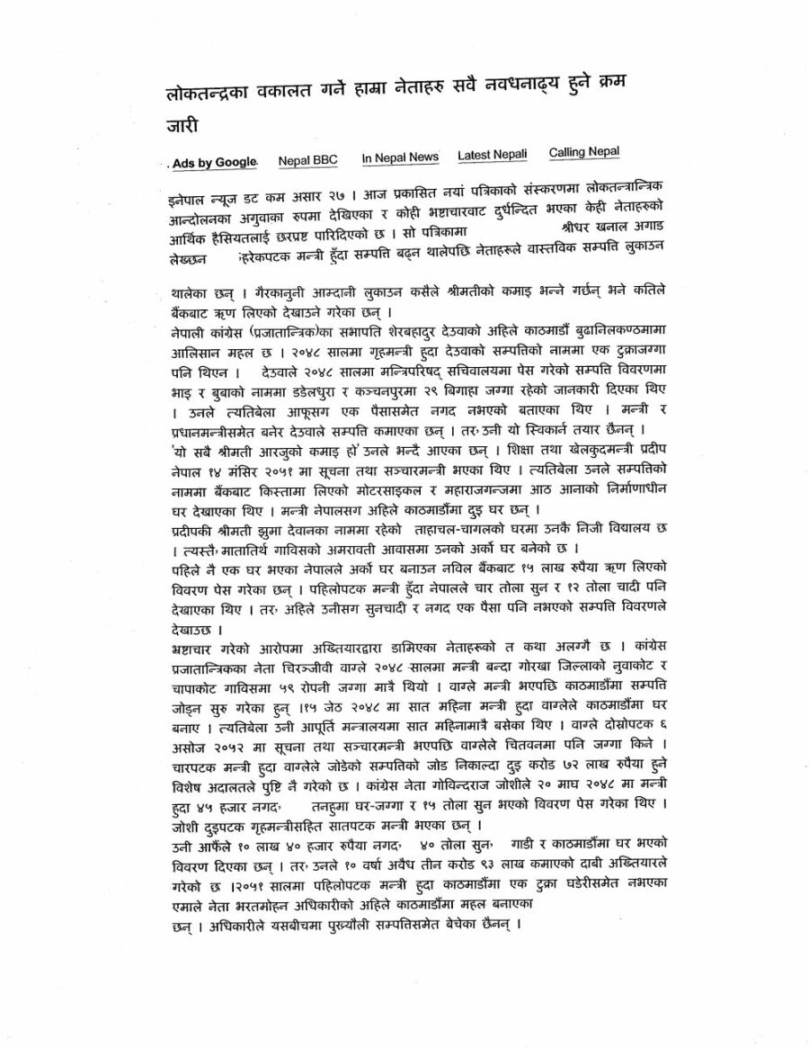 Please find a worth reading article related to corruption in Nepal (source: enepalnews.com, 07-11-2007). Apparently, most of our prominent leaders are heavily involved in corruption. No one seems to be scared of possible punishment.