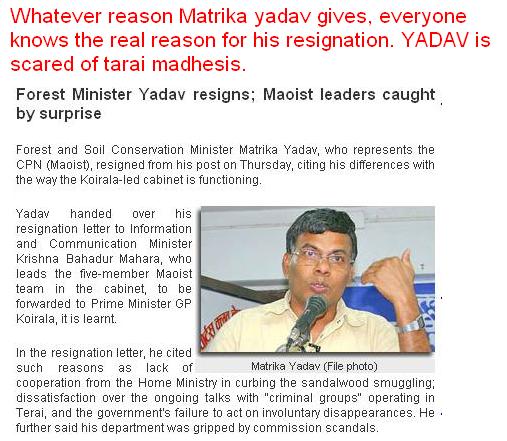 RahulVai, how do u come to conclusion that Maoist are gonna loose the election? Just your analysis from US? Interesting..... Well reason 'I Believe' that Yadav resigned is that his homebase in Terai is in lots of turmoil. He has been loosing ground in Terai within his party, these Jwala singhs and Goits were no one infront of him earlier. But they have started killing everyone so to get everything under control he could not provide time. Above all he was so tied up and frustrated with way things were going in KTM. All these party Politics and Sandalwood smuggling, Sujata's issues. Now since he could put a halt to the sandalwood route, now its time just to clash with congress, which has not been very productive. So Instead he would obviously choose to focus on his stronghold, which is Terai. Maoist are loosing ground in Terai, Yadav was one of the prominent figures in the Terai support for Maoists. So he realized he would be needed in Terai rather than baffle in the Capital. Yadav is one of the strong Cards of Maoists in Terai so they might as well play him where he is needed the most. The Goit and Jwalla guys have created so much terror that if Yadav could solve them or shoot them, maoists will become heroes in Terai. Maoists know that so they are gonna send him back to Terai to solve the issue. Maoists are gonna capitalize on this. My 2 cents. You can throw a dime