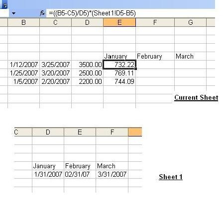 ok buddy, check your email. But I have shown only one example and it follows the condition rascal mentioned. If there is different condition, you can put additional logical conditions. For description, follow above writings. Let me paste for you so that you can give a glance at once => Considering 7 working days and each day worths equal amount, here is one example. For the date cell, click format and click date. For amount , click format and click number. Current Sheet January 1/12/2007 3/25/2007 3500.00 732.22 1/25/2007 3/20/2007 2500.00 769.11 1/5/2007 2/20/2007 2200.00 744.09 Sheet 2 January February March 1/31/2007 02/31/07 3/31/2007 732.22 is E5 ; 1/31/05 is D5 in sheet 2 and I used this formula =((B5-C5)/D5)*(Sheet1!D5-B5) With the reference E5 for current sheet and D5 for sheet 2, all the there is no blank cell between consecutive rows and columns.