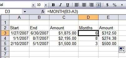 Here is the case - StartDate EndDate Total amount January February March ...... 01/27/2007 06/30/2007 $1,875.00 01/01/2007 08/07/2007 $2,195.00 02/10/2007 05/01/2007 $1,500.00 How to calculate amounts for each month ?