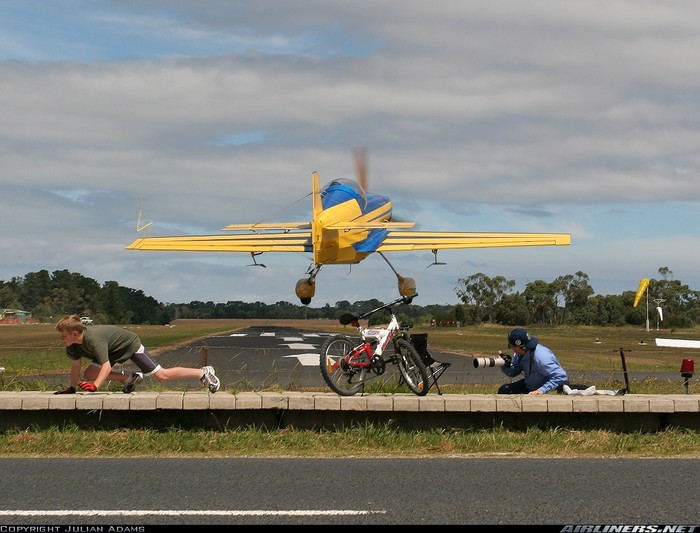 Tyabb (Western Port) (YTYA), Australia - Victoria Photographer's remark: VH-IAC (cn 216-V417) I managed to take this after diving out of the way! Peter and Richard managed to get a bit closer to the action! We're not sure whether his landing gear went over or around the bicycle but either way, IT WAS CLOSE!!! A very good way to have a hair cut.
