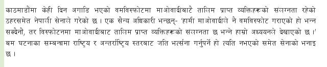 .surunga hatya kanda- Bikash kc’ first say that degenerates panchayat in favor of prachande propped democracy. k bhannaa khojeko surunga matra hatya...so todays killings are not hatya but swarga pathaune kaam???? Ooo that means all those 15000+ went to see Indra’ gala with Menakas...rashwari khadai herchan hola..haina??? prajantra ma marekole hola tyasto.... above and beyond, i've couple of things to learn from Bikash KC...very specific questions in fact. what the heck is that pro panchayati? how do you want to qualify yourself as democrat on and off this board? ok master kc don’t worry too much....come with logic next time...i've couple of snickers stored in a refrigerated vault.. that too especially for you....sounds safe...right???