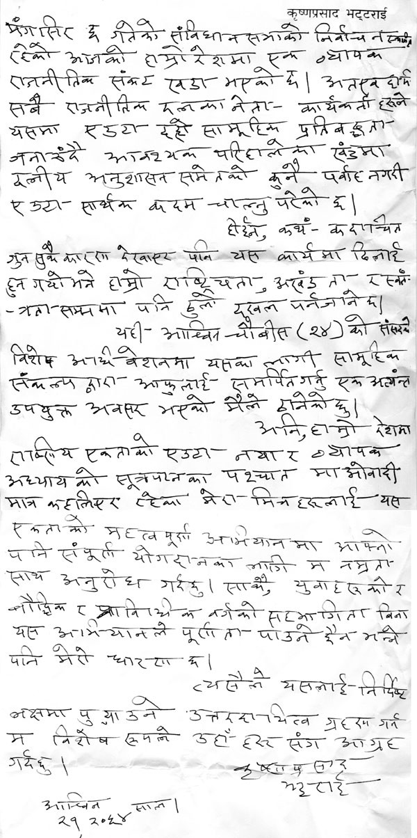aba k bhannne yesta buda lai bhir bata khasna khojni gorulai ram-ram bhan na sakincha kad thapna sakinnna ki kaso hau ational reconciliation policy still relevant: KP Bhattarai Kantipur Report KATHMANDU, Sept 9 - Nepali Congress (NC) founding leader and former Prime Minister Krishna Prasad Bhattarai Sunday claimed that the National Reconciliation Policy of BP Koirala is still relevant. In a press statement today, Bhattarai opined that the increasing distance between the king and political parties would only weaken nationality, independence and democratic practices. Stating that the national recondition policy would be still relevant in coming days, the octogenarian leader has also asked the NC not to erase its own history. Bhattarai’s comments have come after the party’s central working committee adopted a proposal for a federal democratic republic last week. Stating that the institution of monarchy has unifying role for religious, cultural, ethnic and political groups, Bhattarai also made a point that the prevailing transitional period in the country would come to an end only through unity and reconciliation. He added that a feeling of vengeance would only further divide the nation. Nepal’s first elected prime minister and NC founding member, BP Koirala had propounded the policy of national reconciliation in 1976 when he returned from self-imposed exile in India. Bhattarai, who is placed second in the party hierarchy, has been living a politically secluded life in his Bhainsepati residence. He has not attended the interim parliament since April uprising last year insisting that the two factions of NC must unite before that.