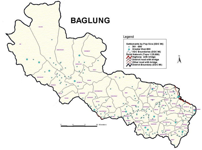 The town also known as BaglungBazar is situated on a plateauoverlooking the KaliGandaki valley. It has been a quaint trading town since ancient times frequented by traders from north and south. More recently, it is visited by tourists seeking to trek to Annapurna,Dhaulagiri,Dhorpatanand Dolpo.Baglung is connected to BeniBazar of Myagdito the north and KusmaBazar of Parvat which are located 13 km to the north and 12 km to the south respectively. A well paved but winding highwayconnects the town with Pokhara,72 km to the east. Highways to connect Jomsom,Mustang,Tibetto the north, Rukumvia Burtibang and Dhorpatan to the west and Sera Bazar via airport (probably will see an extension to Palpa) to the south are under construction. Baglung airport, now defunct, is located 12 km to the south of the town.Baglung has experienced a rapid expansion after the completion of Pokhara-Baglung Highway in mid 90s.