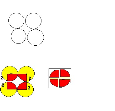 Q. The radius of all four circles is 2 inches. Find the area of the region in between four circles. here is the answer i have the answer but i could not email you with the picture. if i ahve your real email address i can send you picture and explanation. but i will try to explainh here better. The area of one square is = pi R square = 3.14 * 2 * 2 Now if you Put four circle together it will look like this...see the attach file ( -)(- ) ( -)(-)  now draw a radius from one circleto touch the other square. it will form a square. so the area of square with length (2+2) = 16. now if you draw it you will see that inside the square there are four 1/4 parts of circle. so these four one fourth part make the wholecirclewhihc is area of a circle so area in between the circle = area of square - area of circle = 16 - (3.14 * 4) = 3.44 square inches. if you need picture. send me your other email address. xcopsgen Texas Rocks...