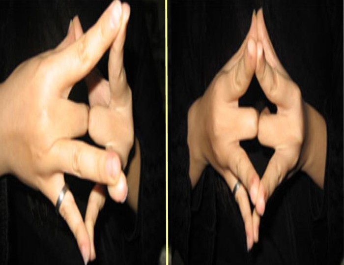 Firstly, show your palm, center finger bend and put together back to back. Secondly, the rest 4 fingers tips to tips Games begin, follow the below arrangement, 5 finger but only 1 pair can split.
