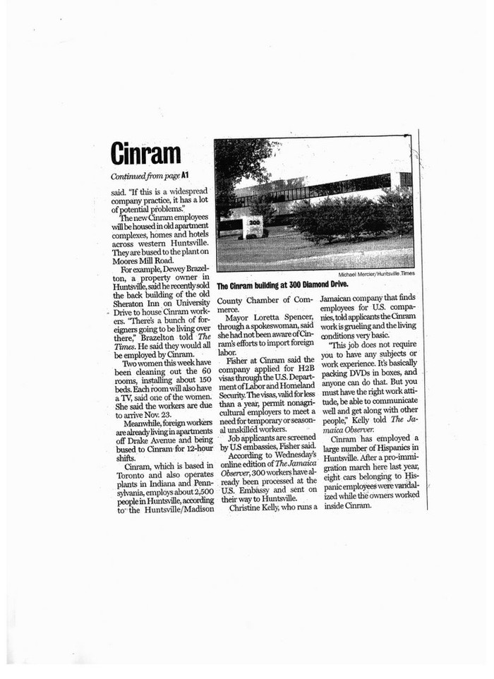couple of month ago there was an article on the huntsville times about sindram ,critising about its step to bring foreign workers. the artical said that, there are already hundreds of unemploied or part time emploied people in huntsville . it is absolutely un necessary to bring foriegn workers. therefore it is clear that there is a different motive behind bringing all there workers .