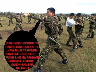 BRITISH GOV HAVE DONE ENOUGH!!!!!! NOW THEY WILL STOP RECRUTING GURKHA ANI .........KHALAS TERO BAU KO MASU BHAAT JATHA ... NEPAL MA TETRO GARIB JANTA CHAN JASKO KAMAI CHAINA JO MUJJJIII POUND KAMAUCHA TESYESKO GAAD CHILAUCHAA BHANEKO YEHI HO...BHUTRO KOO SUPPORT...........GO AND TALK TO PEOPLE IN LIMBHUWAN DISTRICT IN NEPAL. JATHA HARU NEPAL TUKRYERA .......ABA BRITISH KO GAAND MARNA JANE???????? ULTAI BRITISH LE DINCHAAA ANI KHALAS MASU BHAAT..........NAKARA YA AYERA......KHATE MUJIIII.....
