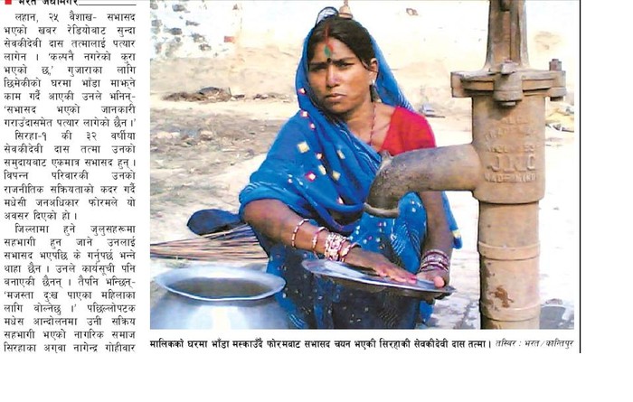 समानुपातिकबाट सभासद चुनिएकी कांग्रेसकी कृष्णाकुमारी परियार शुक्रबार काठमाडौं जानुअघि पोखरामा छिमेकीले चिनोका लागि बनाउन दिएको ब्लाउज सिउ“दै । यही पेसाबाट परिवार धान्दै आएकी परियारलाई कास्कीबाट सभासद चुनिएपछि अब कपडा सिउन नभ्याउने भन्दै छिमेकीहरूले अन्तिम चिनो बनाउन लगाएका थिए । उनले पनि अब जनताका काममा खटिनुपर्ने भएकाले कपडा सिउन नभ्याउने बताइन् । |