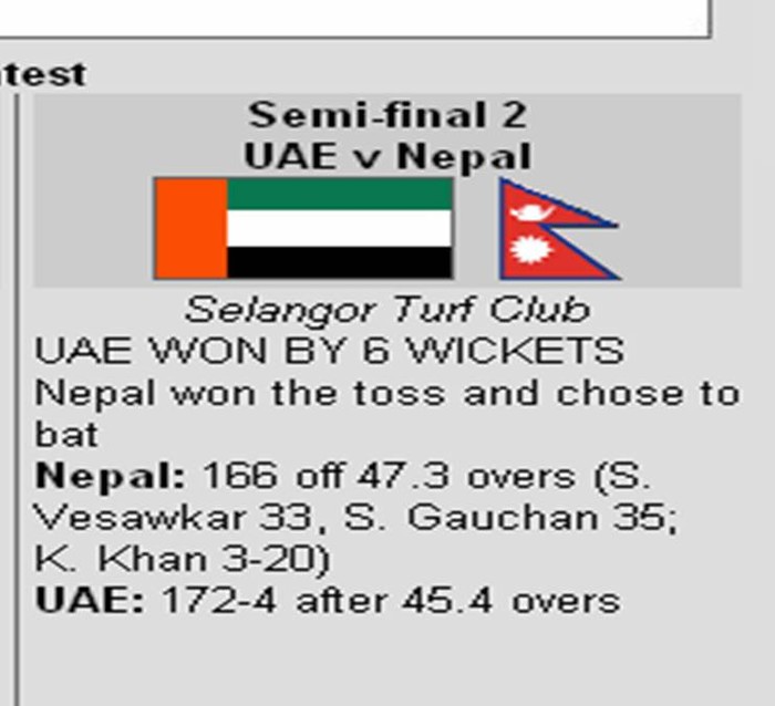 Nepal: 166 off 47.3 overs (S. Vesawkar 33, S. Gauchan 35; K. Khan 3-20) UAE: 148-4 after 42 overs
