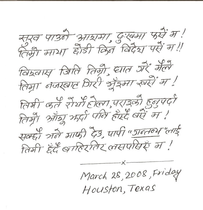 This is my first posting in www.sajha.com and I first public appearance in field of Nepali Literature. I would like to appreciate sajha.com for providing a ground for a new comers like me. Your comments would be appreciated. THANK YOU !!