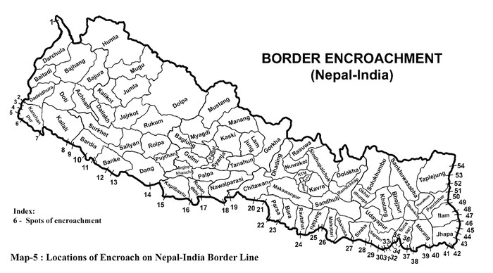 India is the country with bigger size but tiny heart! Altogether 26 out of 75 districts of Nepal have border linkages with India, of which 21 are undergoing the violation of their territory by India. There are 54 such border points within those 21 districts where Nepal’s territory seems to be encroached upon. The total area under encroachment is estimated at around 59,970 hectare, of which Kalapani-Limpiyadhura alone covers 37,840 ha, Susta area 14,860 ha, various places in Jhapa district cover around 1,630 ha, and other places in other districts occupy around 5,640 ha. Taken together, the following locations of the Nepalese territory have frequently been reported as encroached upon by India:- 1. Darchula District Kalapani-Limpiyadhura: 2. Kanchanpur District Bramhadevmandi-Purnagiri: Tanakpur Barrage and Inundated Area: