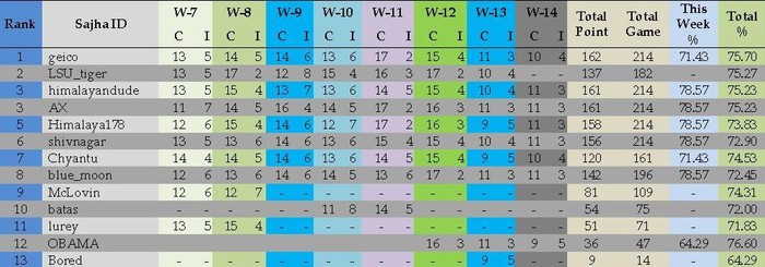 Hello Guys, here I am continuing tracking the NCAA games (bowl game) and update results. First of all, congratz OK sooners and FL gators and all who made to BCS bowls or other bowls Also, I , on behalf of participants, would like to thank geico for his contributions to this thread till now. **Week 15 Results**