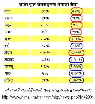तर हालै प्रकाशित सेनामा जातीगत उपस्थीतिको तथ्यांकले यी कुराहरु मिथ्या हुन भन्ने देखाउँछ । नेवारहरुको ठूलो संख्या सेनामा छन । जातीय समानुपातिक उपस्थीतिलाइ मापो मान्ने हो भन्ने नेवारहरु चाहिने भन्दा बढी नै उपस्थीत छन । सेनामा जान इच्छुक जातीलाइ शुरो जाती मान्ने हो र जनसंख्याको अनुपातमा त्यसलाइ दाँज्ने हो भने नेपालका शुरो जातीहरु क्रमश: क्षत्री(३.४४:१), ठकुरी(२.७८:१), गुरुंङ(१.४६:१), मगर (१.४३:१), ब्राम्हण (१.२३:१), र नेवार (१.१३:१) रहेछन (हेर्नुस रातो गोलाहरु)। यस्तै जनसंख्याको अनुपातमा कम उपस्थीति भएकाहरु क्रमश: राइ (०.९३:१), तामाङ (०.८०:१), लिम्बु (०.७६:१), थारु (०.७३:१), र दलित (०.४७:१) हुन आउँछ (हेर्नुस नीलो गोलाहरु)।