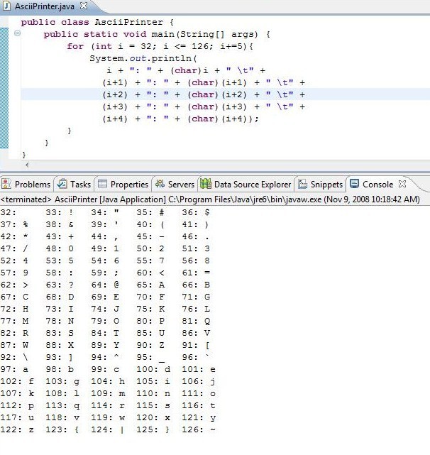 Design and implement an application that prints a table showing a subset of the Unicode characters and their numeric values. Print five number/character pairs per line, separated by tab characters. Print the table for numeric values from 32 (the space character) to 126 (the ~ character), which corresponds to the printable ASCII subset of the Unicode character set. Compare your output to the table in Appendix C. Unlike the table in Appendix C, the values in your table can increase as they go across a row.