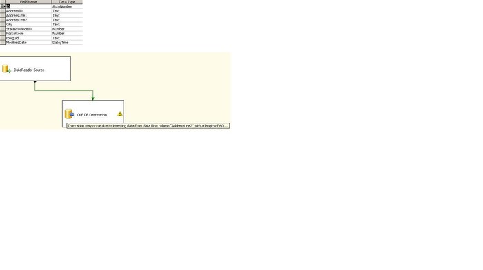 "Warning 1 Validation warning. Data Flow Task: OLE DB Destination [482]: Truncation may occur due to inserting data from data flow column "AddressLine2" with a length of 60 to database column "AddressLine2" with a length of 50"