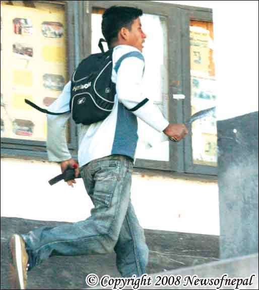 अराजकताः धादिङ हत्याको विरोधमा बिहीबार आ³वान गरिएको उपत्यका बन्दका क्रममा ~!more!~ अस्कल क्याम्पसमा दिनभर पटक-पटक बन्द र्समर्थक विद्यार्थी र बन्दको विरोधमा उत्रिएका वाईसीएल कार्यकर्ताबीच झडप भयो । तस्वीरमा झडपकै क्रममा अस्कल क्याम्पसको पहिलो तल्लामा हातमा खुकुरीसहित देखापरेका एक वाईसीएल कार्यकर्ता । तस्वीरः रवि मानन्धर/नेस