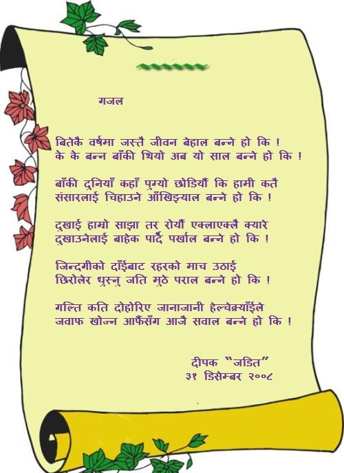 चौतारीवासी बान्धवलाई नयाँ वर्षको शुभकामना मेरा सहनामी मित्र एवं एक अत्यन्त प्रतिभाशाली गजलकार, दीपक “जडित”, को यो ताजा, अत्यन्तै समसामयिक र सन्देशमयी गजलको साथ टक्र्याए है ?