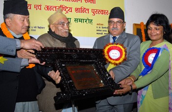 Prime Minister Pushpa Kamal Dahal receives the Dr. Dilli Raman Regmi National Peace Award 2065 from Constituent Assembly Chairman Subash Chandra Nemwang at a felicitation programme organised in the capital to mark the 96th anniversary of Late Dr. Dilli Raman Regmi in Kathmandu on Thursday