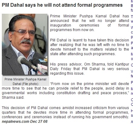 This is actually no news for me. Show me something concrete Maoist government have done and I will say that is good news. I believe Prachanda has taken this step in order to avoid embarrassment. Every time he gets in some formal ceremony all he tries is to defend atrocious behavior of his cadres. And call for the hour for him is to avoid any ceremonies.