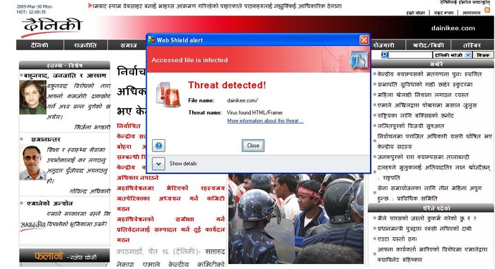 Dear Sajha Reader, MySansar.com has been affected with Worms. There are three malicious script seen on mysansar.com which can easily get important information from your system cookies. If you have the latest Antivirus, it will catch the Worm and quarantine it otherwise you are out of luck. Your important credential may be on the hand of online predators. Please don’t browse mysansar until the scripts are cleaned up from the site. Thanks, sapanasansar