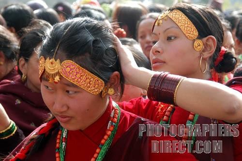 Limbu ni beauties at Chyabrung dhol naach The word Limbu means an archer, or bearer of bow and arrows. Their ancestral and original stronghold known as Pallo Kirat or Limbuwan spans from Arun River in Nepal to the Kingdom of Sikkim in the east. In Nepal, Limbus live and work in the districts of Sankhuwasabha, Tehrathum, Dhankuta, Taplejung, Panchthar and Ilam. Their scripture is called Mundhum. Fedangba, Shamba and Yeba-Yema are their sacred specialists. Limbus have their own script called Sirijunga. There are many books written in the Limbu language. Their faith is enshrined in the evergreen Cynodondactylon (dubo) grass and rocks. They cremate their dead. They celebrate the dance festivals of Kelangma popularly known as Chyabrung dhol naach (two-sided drum) and Yalakma (rice harvest dance) as major events. Chyabrung or Ke, a long cylindrical hollow, two-sided drum, is the most popular musical instrument of the Limbu Community. Hence the folks from Limbu community also called this dance "chyabrung naach". The dancers hang the Chyabrungs around their neck and beat the drum with palm on one side and with a stick on the other side. In this manner, the Limbu dancers execute delicate and complicated foot works to the beats of the Chyabrung. It is a song less dance and is based on rhythmic music. In this age-old folk dance, the Limbu dancers depict graceful movements of wild animals and birds. Limbus, in general, marry within their own community and also with Rais. Boys are at liberty to choose a girl and girls are equally free to decide whether to spend life with the boy in question or not (Jones and Jones, 1976). Cross-cousin marriage is not allowed in Limbu culture. Marriage between a man and the widow of his elder brother can take place if they mutually agree. Marriage between a man and a woman outside family relations and having different thars (clans) is also possible either by arrangement or by mutual consent of the boy and the girl in question. In Limbu's wedding, asking for a girl's hand is the most important ceremony. In this system, the girl can ask for anything and an unlimited amount of gold, silver, etc. This confirms to the girl's family that the boy is financially secure enough to keep their daughter happy. Few days after the wedding, the boy's family members have to visit the girl's house with a piglet and some alcoholic and non-alcoholic drinks depending upon the financial standard of his house. The key ceremonies of a Limbu wedding take place in the groom's house rather than that of the bride's because girl has to stay with her husband. There are two special dances in this ceremony, one is called "yalakma" or dhan nach in Nepali(rice harvest dance) and "Kelangma" or Chyabrung in Nepali. Yalakma is characterized by men and women dancing in a slow circle, whereas Kelangam consist of complex footwork that goes with the beat of the drums. Anyone can join the dance and they can go for long hours. Yalakma also celebrates the harvest season in addition to being a feature of social occasions including weddings. Points to be taken: Though Limbus aren't Hindu, they are recognized in Hindu Society. Nepal's pre-eminent sociologist, Professor Dor Bahadur Bista, asserted that, of all the proverbial thirty-six caste and ethnic groups of Nepal, the Hindu caste system made the least impact on the Limbu. In part, this reflected not only their geographical distance from the seat of power in the capital city of Kathmandu but also their cultural independence.