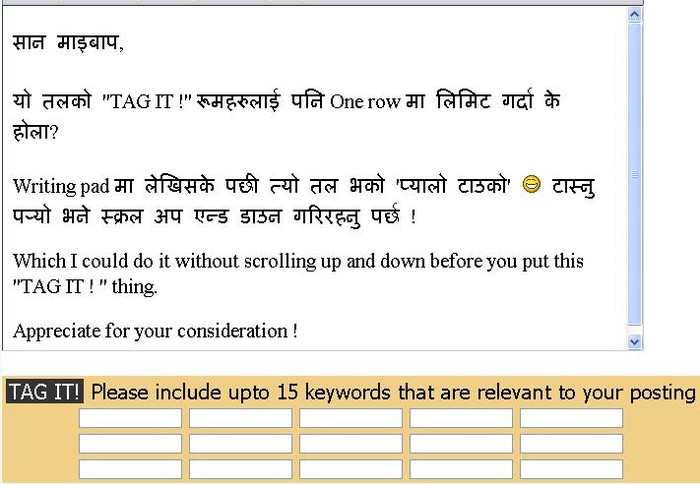 आदर्णीय राहुलदाइ अनी अरु शुभ चिन्तक साथीहरु हुन त personally एस्तो intrusive ad मलाई पनि एकदम मनपर्दैन। तैपनी मलाई त्यो कम्पनी बाट धेरै नै ईमेल आयो एक चोटि ट्राइ गरेर हेर भनेर। त्यो गगन्चुम्बी ad दिनमा अथवा २४ घण्टा मा एक चोटि मात्र visitorले हेर्नु पर्ने भएकोले पनि मैले सोचे - ठिकै छ आज एक चोटि ट्राइ गरेरै हेर्छु भनेर। मोस्त लाइकली आज पछी यो ad यता हुन्न नै होला भनी मेरो दुई शब्द यही तुङ्यौछु! [if you have cookies enabled in your browser you should not see this ad more than 1 times in 24 hours (from the same computer)] Please be informed that this type of ad is not a Virus or Spyware.