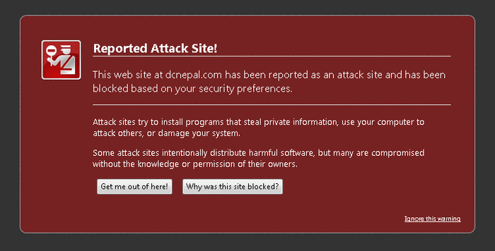 both yesterday and today in live ana, Ram hari said don't use firefox and use internet explorer so i checked dcnepal .com in firefox and it shows that it's an attack site. internet explorer does not have that kind of feature of warning visitors. I think that is very irresponsible to ask people to go visit site with malicious content. Google search also says this site may harm your computer. those who visit dcnepal their computer may be infected already with malicious codes you better disinfect your computer otherwise your computer may be compromised