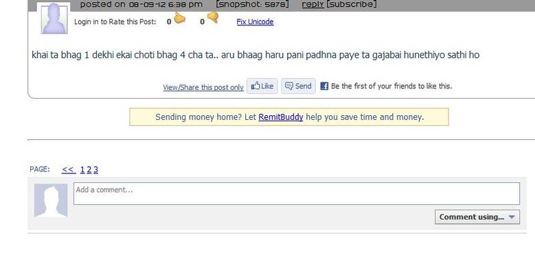 एक भन्दा धेरै पानामा सामाग्री रह्यो भने सान दाइ को यो जिनिस मा अन्तिम पेज नै "डिफल्ट " भै बस्ने हुँदा यो पाना अन्तिम पाना हो . ओरिजिनल पोस्ट र अन्तिम पेज मात्र देखिन्छ . पेज न. १-२ मा क्लिक गरी सबै भाग हेर्न , पढ्न सक्नु हुने छ . तल को चित्रमा पेज न. स्पष्ट संग देखिन्छ . धन्यबाद !