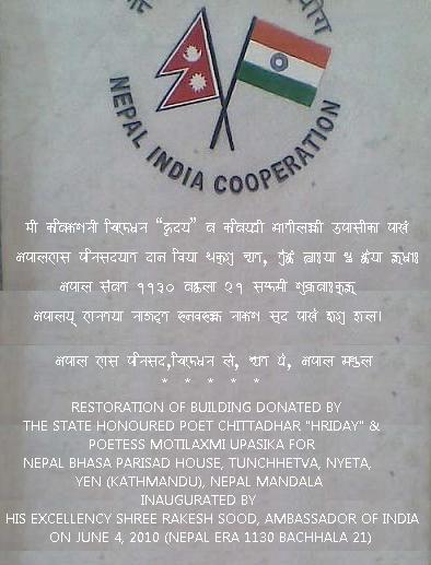 उकुन्हुतिनि नेपाल मण्डल येँया न्येते भारतया राजदूत पाखेँ न्हूधाःयानादीगु नेपाल भास परिसदया छेँया शिलापत्रय् दूगु खस भासया पलेसा हीका पाय्छिजुइकः तयेतः कारुणिक इनाप यायतेना छिकपिनिगुनँ समर्थन दुसा, थ्वहे ईमेले नाँ, लजगा व थाय च्वया पासापिन्तः इनाबियादिसँ। छगु कपि जितः नँ छ्वया हैदिसँ। अले नेपाल भास परिसदया नायः भाजु फणिन्द्ररत्न वज्राचार्यजुयाथाय् छ्वया बी। थःम्हँहे वस्पोल नायः गुरुजुयात छ्वया बियादीसाँ ज्यू।