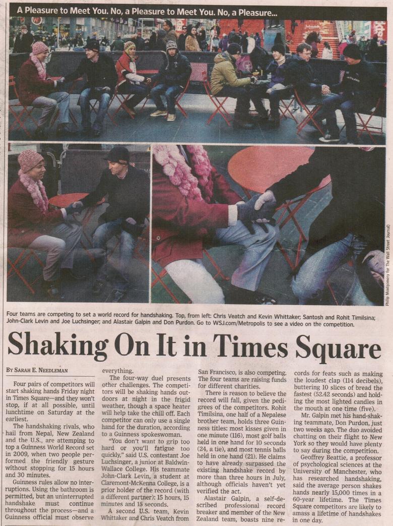 - Longest continuous handshake for 33 hours and 3 minute in 2011 in Times Square, Manhattan, New York, USA.