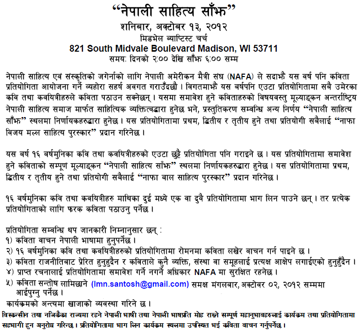 I am looking for Nepali poets to judge poems in Nepali poem competition that is going to be held in Madison, Wisconsin. Are you someone who can do that or do you know who can do that? Please let me know. My email is : [email protected]