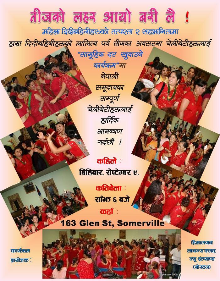 बोस्टनमा तीजको लालित्य महोत्सब । विषेश प्रस्तुतिः तीज सम्बन्धि विषेश कार्यक्रम सहित नाच, गान, हरितालिका तीजको महिमा आदि । चेलीबेटी तथा दिदीबहिनीहरूलाई दाजुभाइले दर
