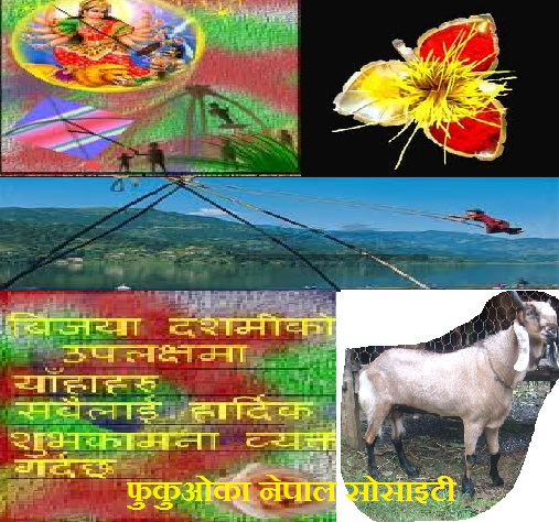 DASHAI IN FUKUOKA नेपालीहरुको महान चाड बडादशैंको अवसरमा टिका कार्येक्रम जापानको फुकुओकामा कहिले: अक्टुबर १७ २०१० कतिबेला:सांझा ५बजे कहाँ: होटल आना हाकाता फुकुओकाका नेपालीहरुले दशैंको सुभकामना एउटै कार्यक्रममा आदान प्रदान गर्न सक्ने र नेपाली नेपाली बिचको भाईचारा अझ मजबुत बनाउन फुकुओका नेपाल सोसाइटीले दशैं टिका कार्येक्रम गर्ने भएको हुदा सबै नेपाली हरुलाई सामुहिक टिका कार्यक्रममा हार्दिक आमन्त्रण गरिन्छ/ आयोजक :फुकुओका नेपाल सोसाइटी फुकुओका जापान