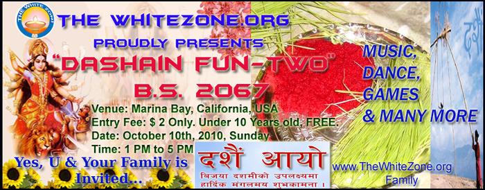 It is our great pleasure to extend a warm invitation to you to attend the"Dashain Fun-Two" hosted by The White Zone on 10TH OF OCTOBER 2010, Sunday, at Berkeley Marina from 1:00 pm to 5:00 pm.Since Dashain festival brings families together, and emphasizes on renewal of community ties; we are planning to have a wider varieties of programs at the picnic surrounding the theme of Dashain. Among others, there will be a Cultural Program, Games and Barbeque and varieties of authentic Nepalese food.Thus, please do your utmost to attend the picnic and bring with you any of your friends and families. Also please feel free to inform other people, who would be interested to join the program. Let us celebrate thisDashain with great rejoice! Best wishes for the holidays and anticipating your participation at the program. Warm Regards; TheWhiteZone Family www.thewhitezone.org Program Coordinators: Mr. Sachin Ghimire and Mr. Bigal Prasai Date : 10th October 2010 (Sunday) Time: 1:00 pm to 5:00 PM Venu : Brekeley Marina, CA, USA Entry FEE: $2 ONLY. Under 10 years old, FREE.